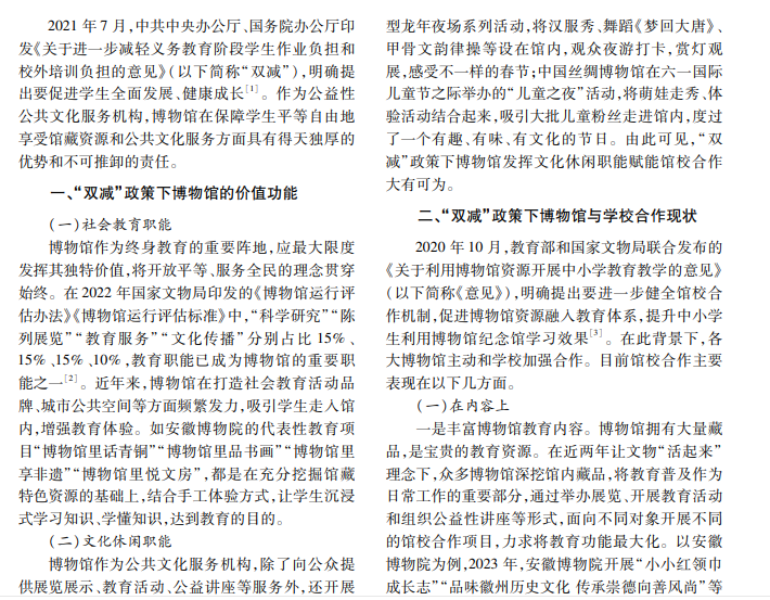博物馆作为培养时代新人的文化阵地之一,应积极承担责任,协同学校教育。本文从“双减”政策 下博物馆赋能馆校合作的现状与问题出发,提出以学生为中心的目标导向、建立专业的人才队伍、开发标准且 系统的课程、打造馆藏资源共享平台四条路径助力“双减”政策落地生效。