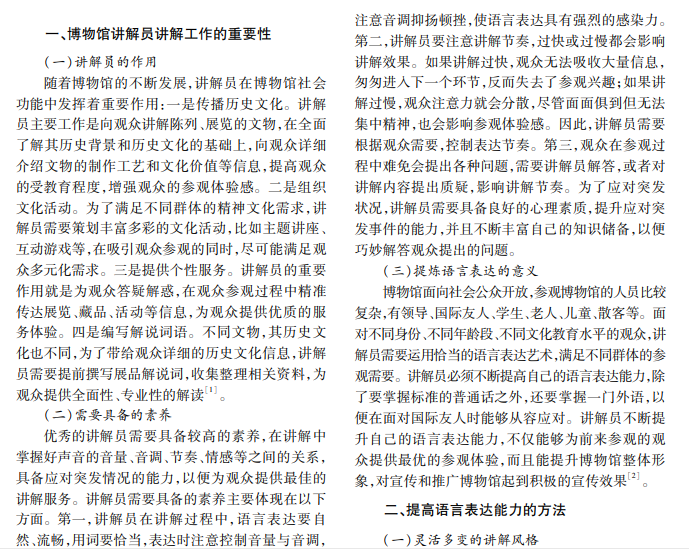 随着经济社会的发展,人们对博物馆的服务水平提出了更高要求。博物馆讲解员作为文化传播者,语言 表达需具备专业水平,才能满足不同人群的需求。本文以博物馆讲解员讲解工作的重要性为切入点,从灵活多变的讲 解风格、专业素养的具体提升路径两个方面对讲解员的语言表达艺术展开分析,希望为博物馆讲解员提供参考。