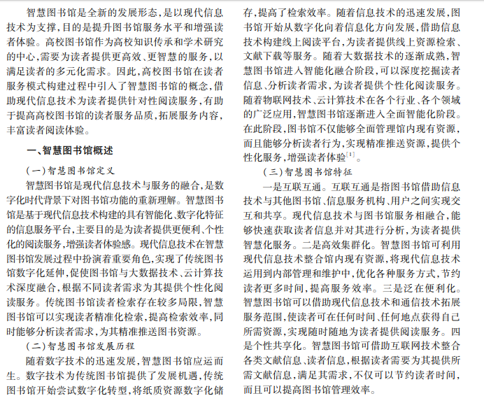 高校图书馆读者服务不仅是其经营发展过程中的重要内容,而且是其发挥自身价值的重要体现。 随着信息技术的迅速发展,如物联网技术、大数据技术等,转变了传统图书馆读者服务理念,服务模式发生了根 本性转变,智慧图书馆应运而生。高校图书馆应构建符合智慧图书馆发展需要的读者服务模式,体现以人为本 的服务理念,提供优质、精准的服务,满足阅读需求,促进自身持续稳定发展。