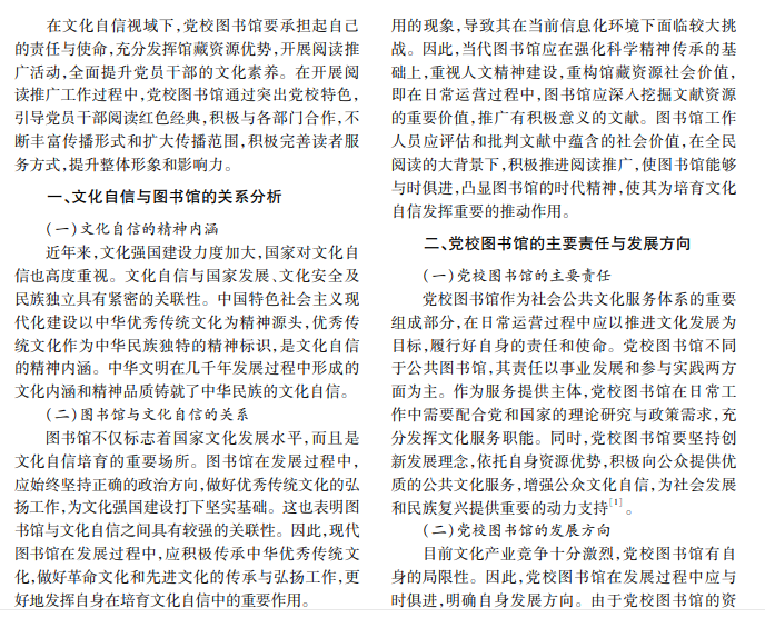 党校图书馆承载着挖掘红色文化资源及传承和发扬红色文化的使命。在文化自信视域下,党校图 书馆应利用自身馆藏资源,重视文化阅读推广,打造党员干部的精神家园。本文从文化自信与图书馆的关系入 手,分析党校图书馆主要责任与发展方向,阐述党校图书馆阅读推广的价值,提出阅读推广优化路径。