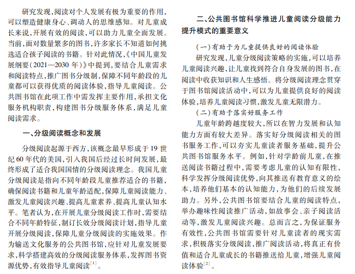儿童分级阅读是针对不同年龄特征儿童开展的长期阅读方案,通过制订科学的阅读规划,确保儿 童阅读能力、感知能力以及分析能力的提升。公共图书馆承担着阅读推广的重要职责,要提升儿童分级阅读能 力,应完善图书馆建设,制定有效的阅读推广模式,培养专业人员,积极开展特色阅读活动,推广儿童分级阅读, 实现儿童阅读水平的整体提升。