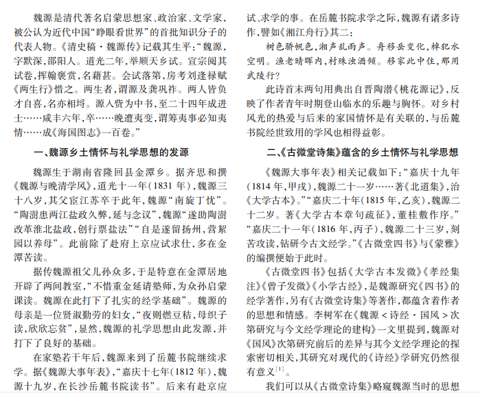 魏源的思想饱含乡土情怀,蕴含着丰富的礼文化要素,这与其生平经历有关,体现在《古微堂四书》 《皇朝经世文编》等诸多著作中。我们可以通过解读著述加深对其人其事的理解,并学以致用。