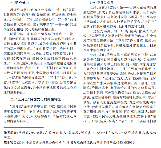 本文从跨国文化共享的视角出发,探讨中越跨境的壮族、岱族、侬族“三月三”跨国文化特征、节日 文化的跨国共享体现,认为基于民族同根、文化同源的基础,在政府主导支持、民间往来的推动下,“三月三”跨 国共享文化不断传承创新,有助于维护和平稳定的中越边境,对促进中越民心相通、构建人类命运共同体具有 重要的现实意义。