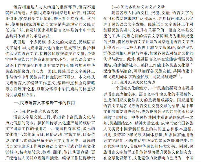 本文探讨推广和规范使用国家通用语言文字、做好民族语言文字编译工作在铸牢中华民族共同体 意识中的重要性,阐述开展民族特色文化保护工作、加强民族语言文字和经典文献的保护和传播、做好经典文 献互译出版工作在铸牢中华民族共同体意识中具有重要意义。