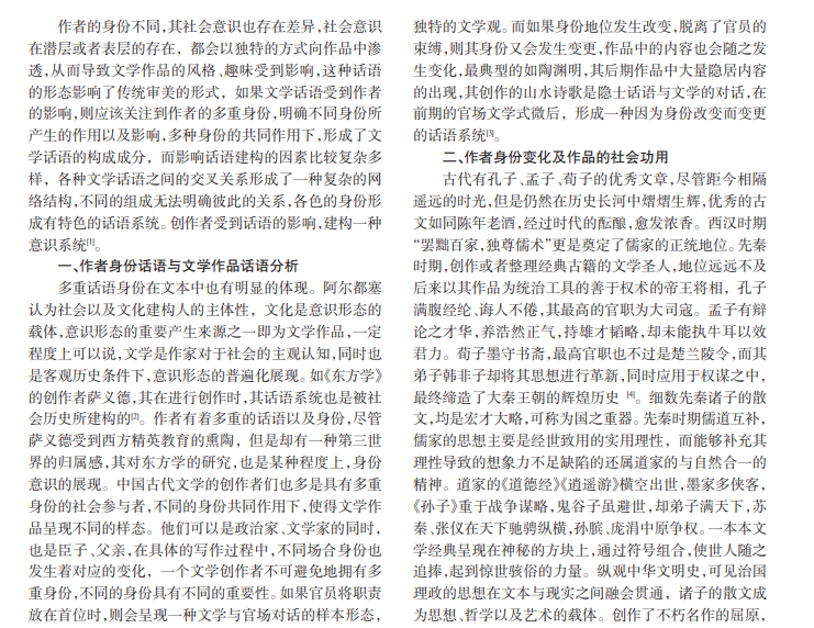 文学具有多层面的功用,一部优秀的文学作品不仅具有帮助人们认识社会的价值,同样能提供给人一种 审美享受,文学不仅是社会现实的反映,同时也能够引发人们对于生活现状以及形形色色的人与事物进行思考,对人 的思想情感以及精神世界发生潜移默化的作用,通过一种渗透人心的精神力量,对人的思想性格以及价值观进行鼓 舞。从古到今,分析作者身份的变化,能够看出文学作品所产生的对于社会的作用。