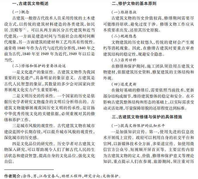 古建筑文物是人们了解历史的直接性证据,对其修缮与保护相当重要。本文从古建筑文物概念和 重要性论述出发,在遵循修护文物基本原则的同时,提出一系列新措施,如提高文物保护的认知水平、增加修缮 成本的投入比例、优化文物修护的专业制度、加强文物储藏设施的建设、贯彻落实有关的修护政策等,为古建筑 文物修缮与保护的研究提供全新的思考方向。