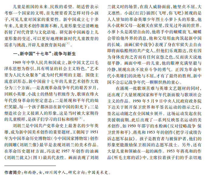 新中国成立七十多年来,儿童美术创作源源不断,儿童形象变迁清晰地折射了时代背景与文化语 境变迁,不仅反映了社会历史背景的变化,而且为新时代儿童教育提供了启示。本文梳理新中国画卷上儿童形 象的变迁历程,分析变迁背后的社会因素,探讨新时代儿童教育的理念与方法,以期为我国儿童教育的发展提 供有益参考。