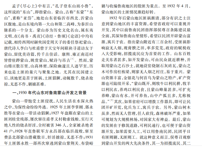 蒙山,古称“东蒙”“东山”,素称“亚岱”,是山东境内第一大山和第二高峰。蒙山绵亘数百里,山高 林密,深险幽邃。民国建立后,该地苦于匪祸,1932年蒙山地区匪祸渐清,山东省政府注意到蒙山蕴藏的丰富资 源,遂着手开发蒙山。蒙山开发计划,数次启动、搁浅,循环往复,终不了了之,其中固然有蒙山重峦叠嶂,交通 滞塞等自然因素影响,也与这一时期山东整体发展规划不足、党政分头操作、人力物力缺乏、资金困窘等人为因 素有关。