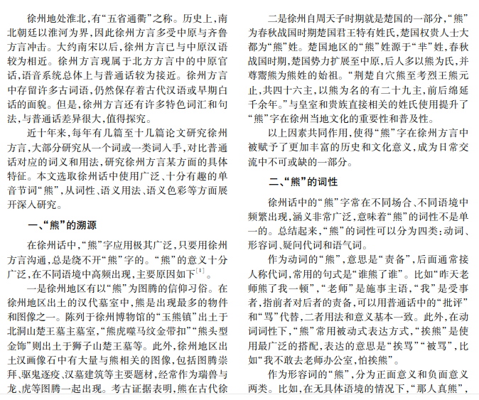 本文选取使用广泛的徐州方言词“熊”,从溯源、词性、语义用法和语义色彩四个方面研究其意义和 用法。首先分析“熊”在徐州方言中高频率出现的原因,其次通过例句分析“熊”作为动词、形容词、疑问代词和 语气词的语义和用法,最后分析“熊”在表达中传达的感情色彩,指出在交际中使用中“熊”的积极意义。