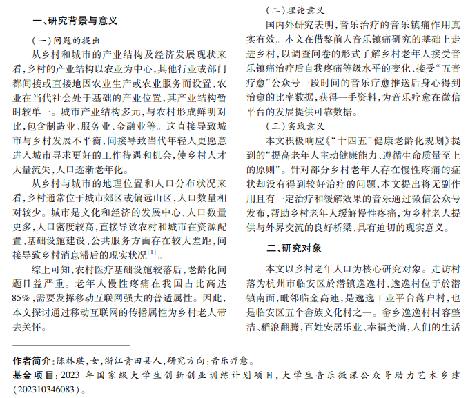 在当前时代背景下,乡村青年人大量流失,乡村人口逐渐老年化。实地调查发现,老年人普遍存在 慢性疼痛(腰酸、头痛、背痛)的情况。基于此,公众号“五音疗愈”在内容选择上融入音乐治疗板块,在艺术乡建 的同时为当地人普及音乐的镇痛作用。音乐镇痛的效果得到了国内外专家认可,该镇痛方法零成本且不会出 现药物带来的副作用,理论上可以有效缓解乡村老年人的慢性疼痛问题。
