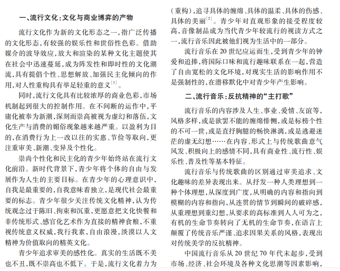 流行音乐作为一种流行文化,营造了自由宽松的文化环境,受到青少年的钟爱和追捧,在潜移默化 中对青少年产生影响。要正视流行音乐中的各种诉求,研究青少年追捧流行音乐的动机和心理,用包容的姿态 正视流行音乐文化,警惕其可能产生的负面作用。
