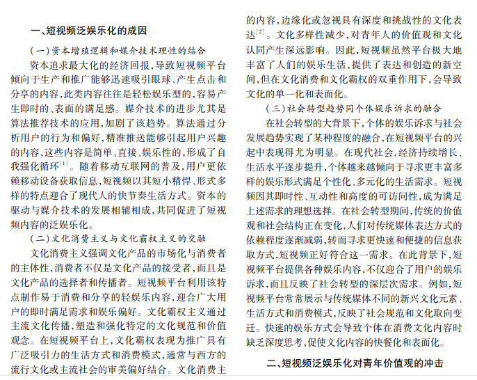 短视频作为视觉文化与互联网技术交融的最新产物,已然成为当代青年休闲娱乐的重要方式,但 当前短视频空间逐渐呈现泛娱乐化传播的景象。青年用户面临理想信念被侵蚀、理性思维被消解、价值取向被 扭曲、审美情趣被异化的现状,需强化积极的价值观叙事、规范传播环境、提升视觉媒介素养、完善社会治理体 系、营造健康的娱乐环境,抵御泛娱乐化的负面影响,引导青年形成健康的价值观。