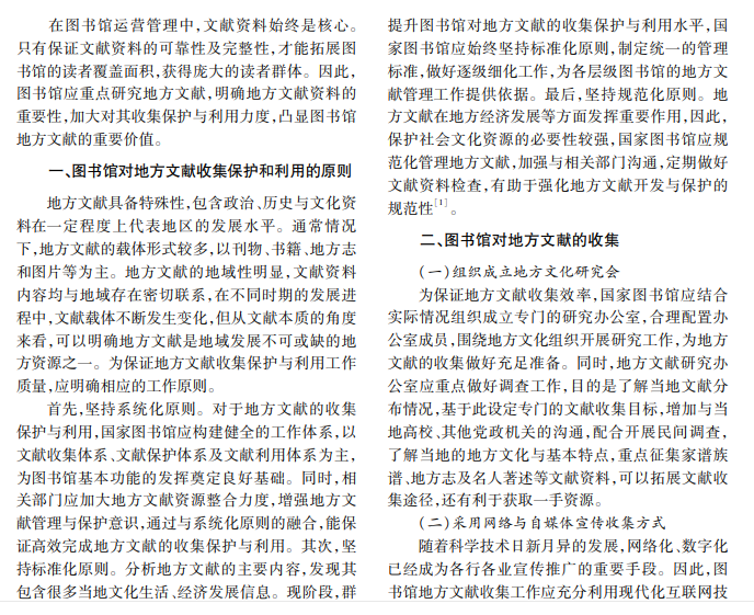 本文分析了图书馆对地方文献收集保护与利用的基本原则,总结地方文献的收集、保护与利用方 法,旨在拓展地方文献的收集与保护途径,强化对文献资料的有效利用,通过提高文献利用率为大众提供便利, 凸显图书馆在社会发展建设中的重要地位,助力实现文明建设及稳定可持续发展目标。