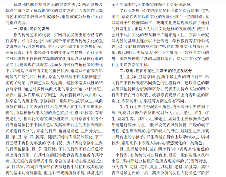 戏曲不仅是中国传统文化的重要载体及代表,也是随着历史社会不断发展形成的一种独特的文化。作为其 中影响范围最大的京剧和昆曲,二者既有形成发展上的共同点与联系,也存在一定的区别。两种剧目在四大行当的特 点及其着装象征上有着一定的相似性,而这一部分也是京剧和昆曲文化中的重要部分,是深入研究戏曲文化的必要途径。