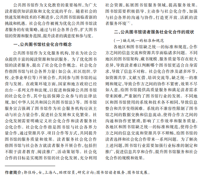 社会化合作指通过与社会各界合作伙伴共同推动图书馆服务发展,以提供更多样化和个性化的服 务内容,满足读者日益增长的需求。本文提出一种可行的公共图书馆社会化合作优化策略,旨在帮助图书馆改 善读者服务,提升社会影响力,促进图书馆与社会各界深度合作,推动图书馆服务的社会化转型。