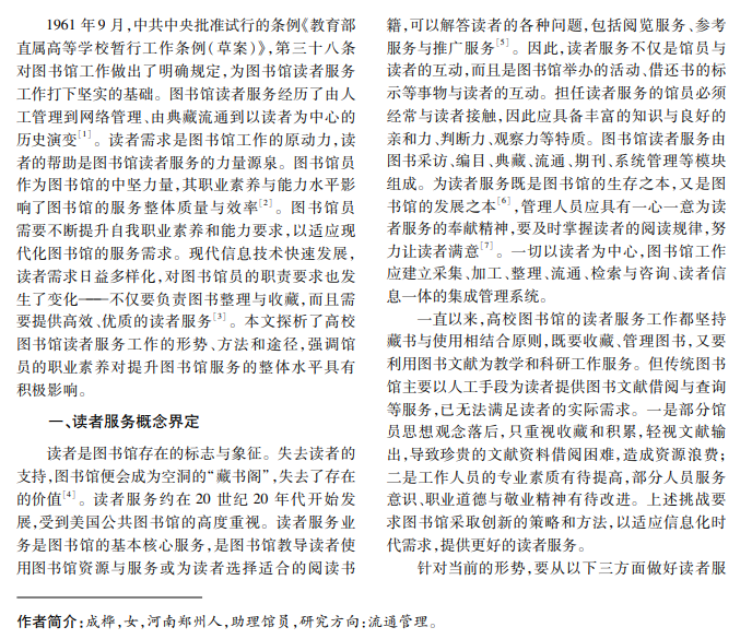 图书馆员作为知识导航者,要在读者和信息资源之间发挥桥梁作用,通过提升自身职业素养和服 务效率,切实为读者提供优质服务,优化图书馆的读者服务工作。本文以高校图书馆读者服务的发展特点和发 展现状为突破口,阐释高校图书馆读者服务的发展瓶颈,探索了数字化转型过程中的发展路径,为信息化时代 背景下高校图书馆读者服务质量和服务效能研究提供借鉴与参考。