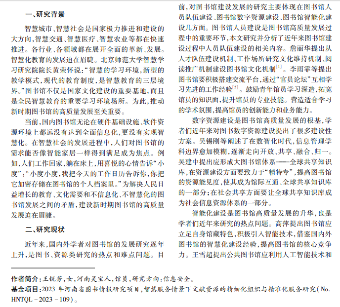 本文研究智慧化图书馆高质量发展的着力点及优化路径,提出图书馆人文生态环境建设与发展的 路径、人机协同工作的方法,探讨图书馆数字资源的完整性建设、数字资源的净化路径和数据资源的安全共享 技术,智慧化建设的方案和实施技术,提出优化路径,为图书馆可持续性发展和智能化建设提供理论基础和技 术支持。