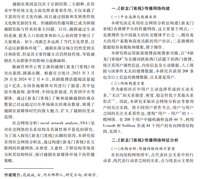 在新媒体环境下,越剧传播应顺应时代潮流,积极拥抱变革。本研究利用社会网络分析法,研究越 剧《新龙门客栈》的传播现象发现,越剧在传播时具有传播网络结构不紧密、传播主体不均衡、传播路径不完善 等问题。应通过发挥意见领袖的引导效果、推动多元主体深度互动、借助融合介质创新特色产品等方式,不断 提升越剧的传播效果和影响力,让该传统艺术形式在现代社会焕发新的光彩。