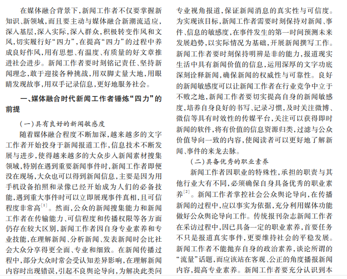 随着媒体融合时代的到来,传媒行业应培养新闻工作者适应媒体发展和信息传播需要,坚持正确 舆论导向,提高新闻舆论的传播力、引导力、影响力、公信力,打造一支政治过硬、本领高强、求实创新、能打胜仗 的新闻舆论工作队伍。本文重点研究锤炼新闻工作者“四力”的前提与主要措施。