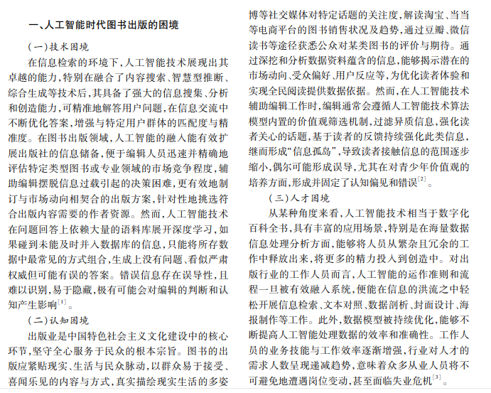 人工智能技术的迅速崛起和其在各领域的广泛运用,促使图书出版行业进入了新的发展阶段,推 动图书出版行业向人工智能时代前进。如何面对人工智能时代给图书出版行业带来的困境并有效破局,激发 技术革新的浪潮以促进图书出版业的新兴进展,成为图书出版工作者应深思的问题。