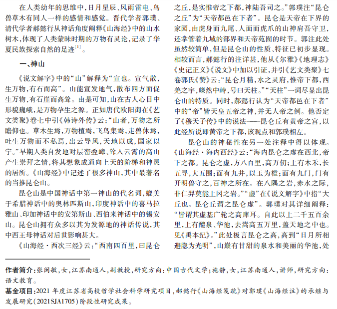 中国神话散见于古籍,尤以《山海经》中为多。其中,“山水树木”是《山海经》中神话阐释的重要对 象。原始先民最早的自然崇拜对象便是山水树木,与之相关的神话成为原始自然神话最重要的组成部分。《山 海经》产生于原始人类的万物有灵论,从晋代学者郭璞、清代学者郝懿行等人对《山海经》的阐释中,可以充分感 知原始先民对于原始自然神秘力量的探求。