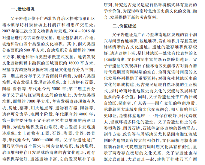 全国重点文物保护单位———父子岩遗址位于桂林市雁山区柘木镇漓江和相思江交汇处,是广西乃 至华南地区首次发现的洞穴、台地、坡地和岩山等多种聚落形态共存的新石器时代至商周时期文化遗址。本文 阐释父子岩遗址的核心价值、历史价值、艺术价值、科学价值、文化价值、社会价值。