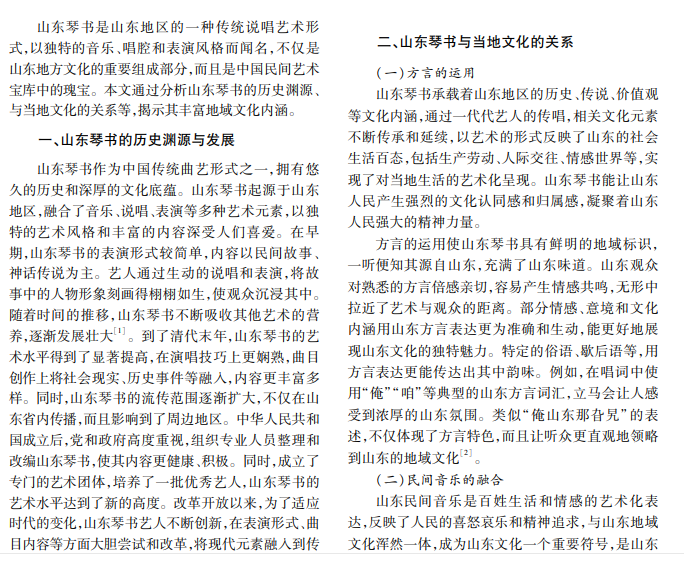 山东琴书是山东重要的曲艺形式之一,具有浓郁的地域文化特色。山东琴书融合了山东地区的方 言、民间音乐、戏曲等元素,反映了当地人民的生活习俗、价值观念和情感表达,具有独特的艺术魅力和文化价 值,在地域文化传承和发展中具有重要作用。