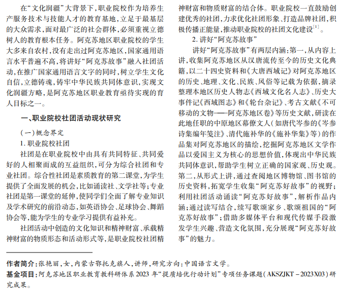 借助社团活动培养学生爱国情怀、铸牢中华民族共同体意识是文化润疆的内在要求,意义重大且影 响深远。阿克苏地区职业院校的学生大多来自南疆农村,见识有限,国家通用语言文字基础薄弱。职业院校存在 对社团活动重视程度不够、发展动力不足的问题。本文从实践路径多元化、实践模式嵌入化、推广手段多样化、推 广媒介现代化等方面,为阿克苏地区职业院校讲好“阿克苏故事”提出可供借鉴的实践路径与推广方式。