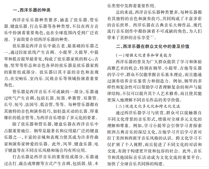 本文探讨西洋乐器在群众文化中普及对于审美培养、文化交流、综合素质提升等方面的价值,提出 加强师资队伍建设、完善场地设施、融入地方文化特色、建立评价与激励机制等普及策略,以推动西洋乐器在群 众文化中更广泛地普及和发展。