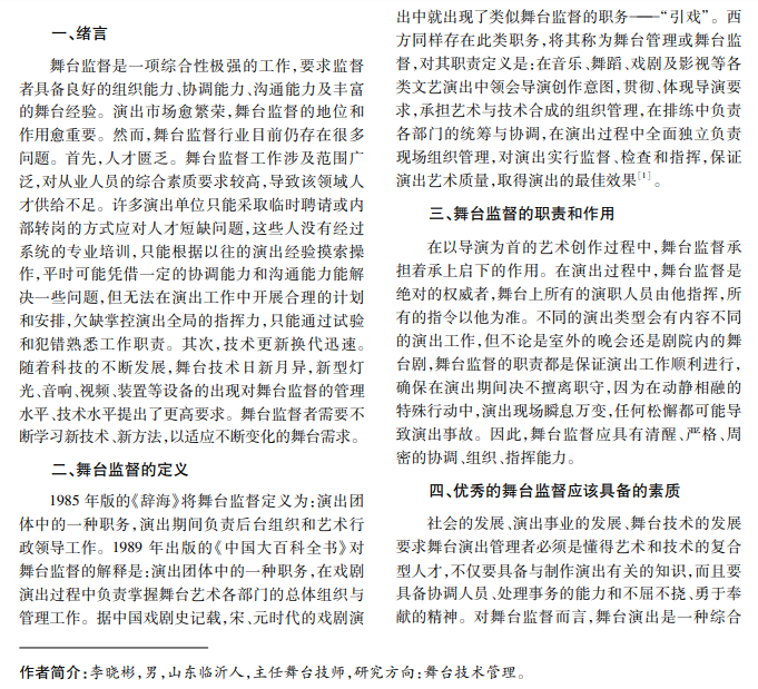 随着我国戏剧演出事业的深入发展、舞台技术的改革与创新,人们逐渐意识到演出事业管理规范 化已迫在眉睫。舞台监督岗位在演出团体中负有重要责任,但人们长期以来对其存在错误认识,因而必须改变 舞台监督的管理理念,提高舞台监督的管理水平,根据我国演出事业现状,探索总结一套适时的、规范的、专业 的、系统的舞台监督管理体系,方能更好地为演出服务。