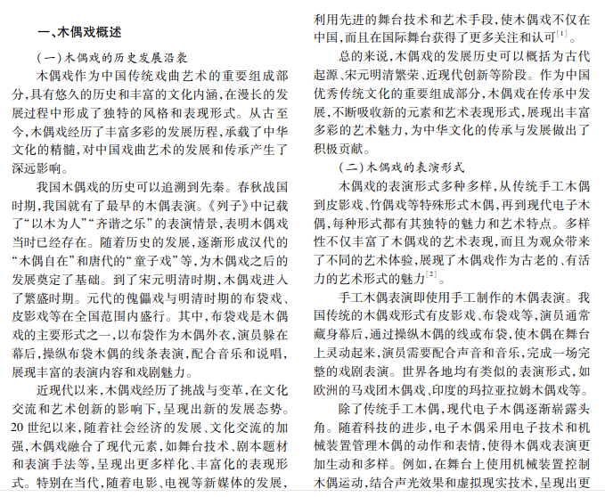 木偶戏作为古老而独特的艺术形式,承载着丰富的文化内涵,是中国传统文化的重要表现形式。 随着现代文化交流逐步深入,木偶戏表现形式不断演变、日益丰富,呈现出新的艺术风貌和内涵。本文探讨当 代木偶戏的舞台表现与发展,分析其特点、创新点以及对当代舞台艺术的影响。