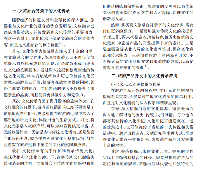 本文旨在探讨文旅融合背景下文化传承与旅游产品开发的内在联系与相互作用。通过分析文旅融 合现状,揭示文化传承在旅游产品开发中的重要性,并提出相应的发展策略,以期推动文旅产业的可持续发展。