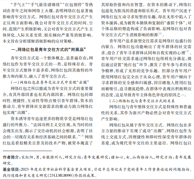 交往不仅是个体与个体的桥梁,而且是个体与环境、自然界相互作用的途径,构成了人类生存形态 和进步基础。网络红包可以缩短青年交往时间,充当虚实空间交往的“纽带”,拓展青年交往范围,但同时也会 成为控制青年群体的“麻醉剂”、导致青年人际关系变质的“氧化剂”、泛泛而乐的“娱乐剂”。本文分析网络红 包对青年交往方式的影响及引导策略。
