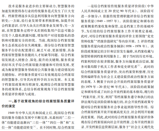 本文从国家政策视角归纳综合档案馆服务质量评价的演变,分析档案馆服务质量评价在各个阶段 的侧重点和维度延伸。经过不同阶段的演变和发展,国家政策引导下的综合智慧档案馆智慧服务评价取得了 一系列成效,为优化综合档案馆智慧服务提供了方向。