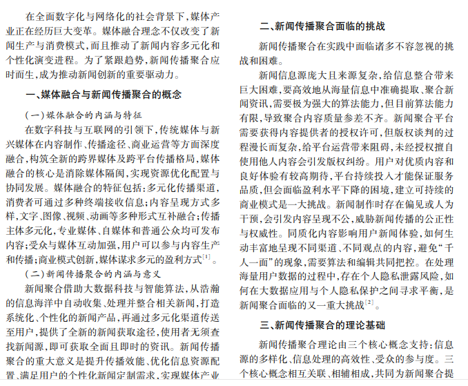 随着数字化的演进、媒介环境的快速变迁,传媒整合已然成为新闻产业发展的必然趋势,新闻传播 聚合助力新闻产业创新发展成为重中之重。本文论述传媒整合与新闻传播聚合的定义与特点,剖析新闻传播 聚合面临的主要困境,探讨新闻聚合的理论支撑,提出四条创新路径。