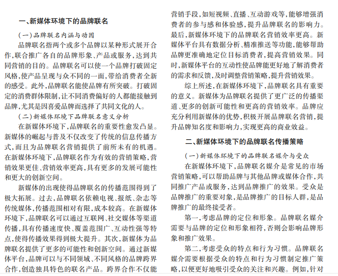 本文探讨新媒体环境下的品牌联名设计与传播策略。对品牌联名的内涵与动因以及新媒体环境 下品牌联名的意义、传播策略、设计方式等展开研究,总结新媒体形势下品牌联名设计与传播策略的有效方式。 同时,结合酱香拿铁、大白兔奶糖联名等案例,分析品牌联名在新媒体环境下的应用策略与传播效果。