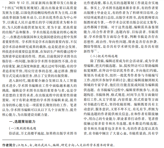 学术图书承担着呈现前沿学术成果、传承优秀文化的重要使命,学术图书编辑在学术图书出版中 扮演着重要角色。新形势下,学术图书编辑核心能力既包括选题策划能力,又包括编辑加工能力。编辑只有不 断提升自身的核心能力,在图书出版中倾注真心、细心、匠心、诚心,才能实现个人职业生涯持续发展,为读者提 供更优质的精神食粮。