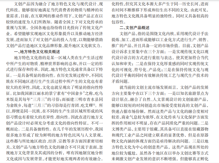 近年来,我国的经济发展水平与国际地位都有了较大程度的提升,国人的民族自豪感与文化自信心也随 之不断增强。在“文化强国”的号召下,我国各级政府进一步加强了对传统文化的挖掘与修复,在文创产业方面也加大 了政策扶持力度。以文化为核心,打造具有地方特色的文创品牌对于提高当地文化形象、促进区域经济发展有着极为 重要的推动作用。基于此,文章对地方特色文化在文创产品中的运用与融合进行了分析、探讨,希望能够为提高地方传 统文化与经济发展水平提供有益参考。