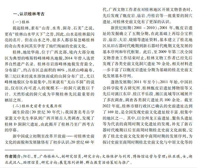 桂林史前遗址类型丰富,已有的考古发掘成果表明,其大部分为洞穴遗址,以甑皮岩、大岩、庙岩 3 个聚落群为主,是岭南众多史前洞穴遗址的典型代表,年代从旧石器时代延续到新石器时代早、中期;余则分布 着岩厦遗址、台地遗址、坡地遗址等类型,以晓锦遗址、全州渡里园遗址、灌阳五马山遗址、父子岩遗址为代表, 年代从新石器时代延续到商周时期。本文选取国家重大遗址保护项目———甑皮岩国家考古遗址公园“一园多 点”中的大岩遗址、甑皮岩遗址、父子岩遗址作为讨论对象。