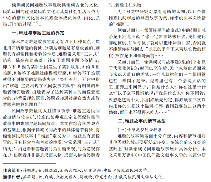 民间难题故事作为傈僳族重要文化符号,不仅是民族精神的支柱,更是文化的独特象征。本文将 傈僳族民间故事中涉及“难题”主题的多种类型放置于同一层面解读,分析情节类型。深入探讨故事蕴含的精 神文化内涵,不但有助于加强傈僳族内部的民族认同,弘扬傈僳族的民族精神,还对构建中华民族共同的精神 家园具有理论价值和现实意义。