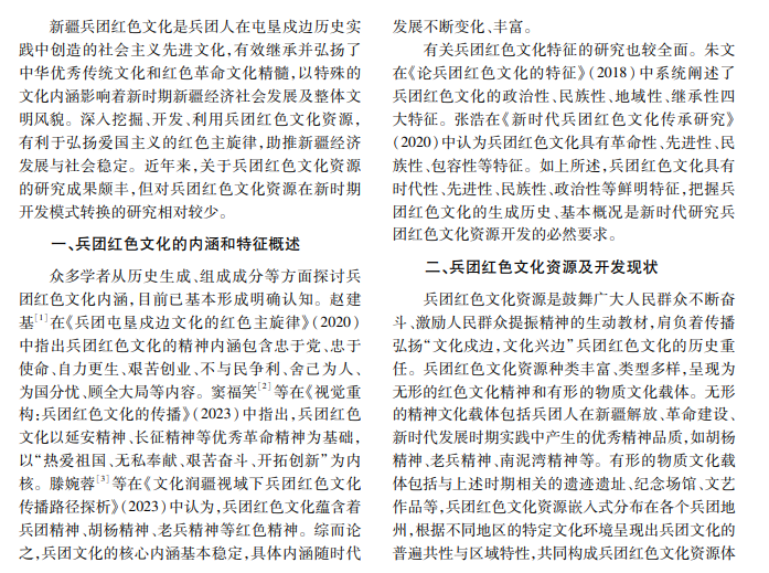 新疆兵团红色文化是以新疆屯垦戍边历史记忆为基础形成的新型社会主义先进文化,利用好兵团 红色文化资源是新时代推进文化润疆工程的需要。本文梳理兵团红色文化的内涵和特点,总结兵团红色文化 资源开发现状及基本路径,探讨兵团红色文化资源发展对策,以期推动兵团红色文化资源实现创造性转化与创 新性发展。