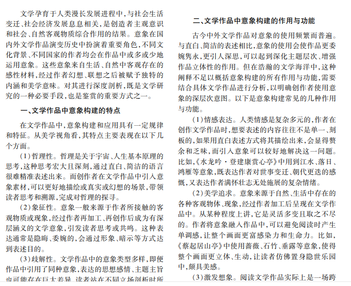 意象是指客观物象经过创作主体独特的情感活动创造出来的艺术形象,具有揭示主旨、烘托氛围 的作用。本文深入探究文学作品中意象的构建思路和美学意涵,简要分析文学作品中意象构建特点和功能,选 出有代表性意义的经典意象进行美学意涵剖析。