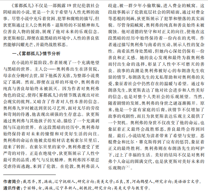 《雾都孤儿》作为查尔斯·狄更斯代表作之一,描绘了孤儿奥利弗·退斯特在贫困和压迫中艰难求 生的故事。尽管这部小说充满了对社会阴暗面的细致描写,但狄更斯并未陷入彻底的悲观主义。相反,他通过 塑造正直而坚韧的主人公,展现了人性的光辉与希望,传递出对社会进步的信念和对未来的乐观期许。对此, 本文分析狄更斯的写作风格与乐观主义的关系。