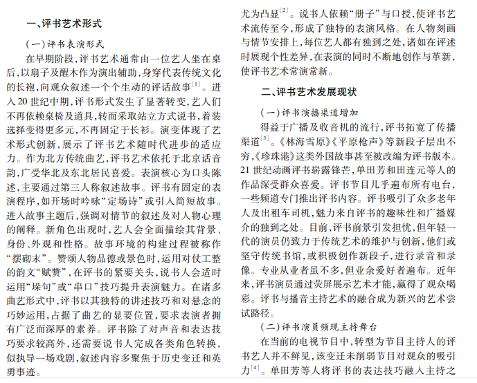 评书以其丰富的文化底蕴和独特的表现形式,在中华文化中占有不可动摇的地位,评书《三国演 义》是该艺术形式的杰出代表。播音主持专业学生深入掌握并传承评书艺术是提升个人素养和职业竞争力的 关键,应积极学习、不断充实自己,向着理想职业的发展目标稳步前进。