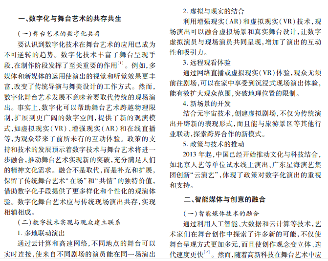 随着数字技术的飞速发展,舞台艺术的数字化日益重要。增强现实(AR)、虚拟现实(VR)和人工 智能(AI)等数字化技术,丰富了舞台艺术的表现手段,突破了空间、时间限制,为观众带来前所未有的互动体验 和沉浸体验。本文分析智能媒体技术的应用、数字集成系统的产业发展、技术与艺术的结合,提出舞台艺术数 字化的合作模式和关键点,强调艺术与技术并行不悖的发展方向。