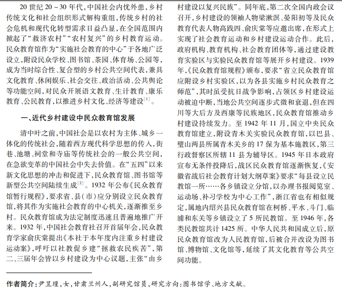 近代乡村建设运动是我国百年乡村建设史中的重要内容,社会教育作为乡村建设运动的重要力 量,主张用教育的力量推进乡村、组织民众,为政治、经济、文化等多方面的建设提供力量。民众教育馆作为“实 施社会教育的中心”,构建了文化教育、生产实验、娱乐休闲、卫生服务、政治活动各类功能的公共空间,深刻地 影响了乡村社会、文化、经济建设事业。