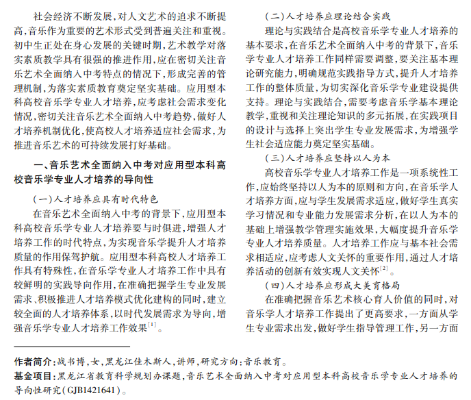 随着中考改革的持续深入,音乐艺术全面纳入中考的呼声越来越高,音乐艺术在初中教学渗透势 在必行,在准确把握音乐艺术纳入中考要求的同时增强人才培养的针对性。本文全面分析音乐艺术纳入中考 对应用型本科高校音乐学专业人才培养的导向性作用,结合高校人才培养工作的实际问题,提出了高校音乐学 专业人才培养的优化策略。