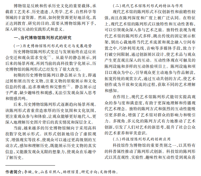 本文研究当代博物馆的形式,分析博物馆与观众的互动手段与方式,包括互动软硬件设备应用、艺 术创作活动推广、教育项目开展,最后探讨博物馆陈列与互动模式的意义,以满足现代观众对个性化、参与感、 娱乐化的需求,使博物馆成为群众学习乐园,有力推动博物馆事业的进步。