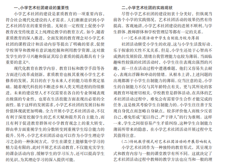 在当今小学教育中,艺术社团的组建和发展是一项非常重要的活动,艺术社团有助于小学生兴趣爱好的 培养,也有利于小学生潜能的开发。然而,目前大部分小学相关领导和教师对于小学艺术社团重要性的认识还不够充 分,致使多数小学艺术社团的建设效果并不理想。为改变这种现状,有必要在深刻理解小学艺术社团重要性的基础上, 深入分析目前小学艺术社团的发展情况,针对现存问题进行探讨并提出一系列有效措施,以促进学生的全面发展,保 证素质教育的顺利推进。