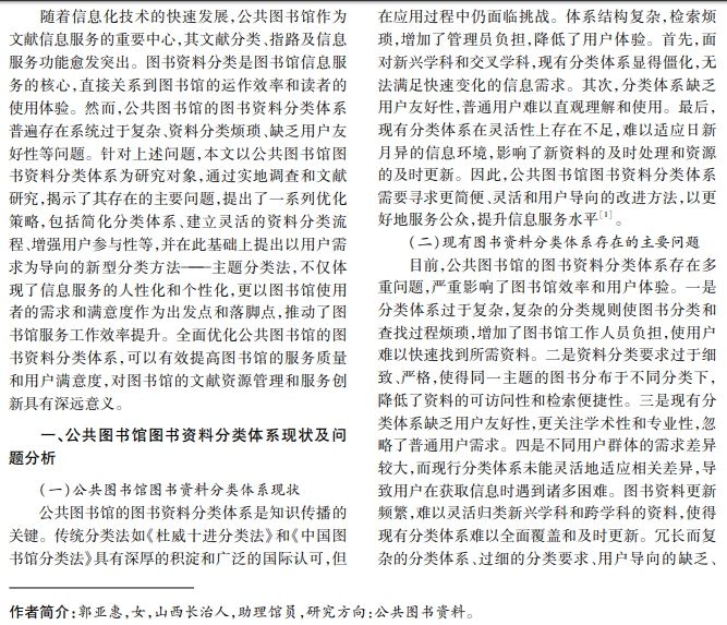 在现代社会,公共图书馆扮演着文献信息服务中心的角色,图书资料分类是图书馆信息服务的关 键。本文以公共图书馆图书资料分类体系为研究对象,探讨其存在的问题和优化策略。通过实地调查和文献 研究,揭示公共图书馆分类体系现阶段的主要问题,针对问题提出主题分类法,以提升用户使用体验、提升用户 满意度、提高图书馆工作效率。